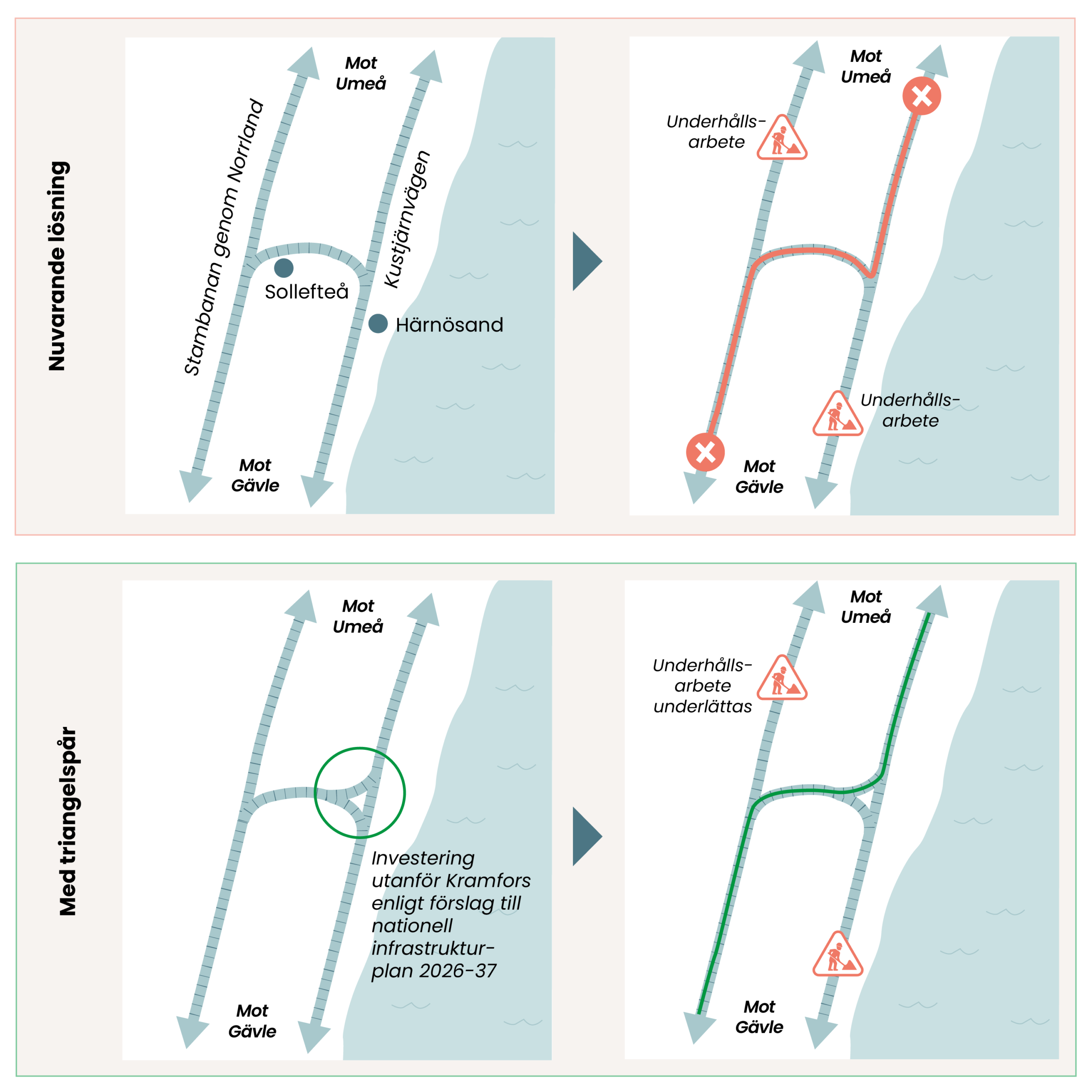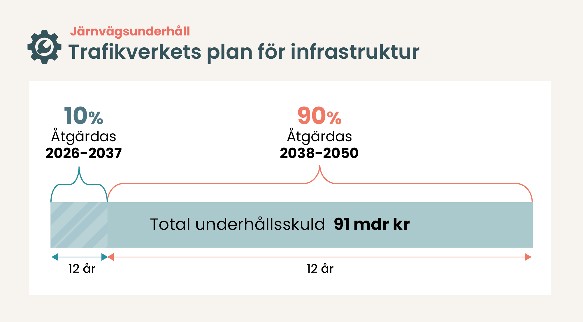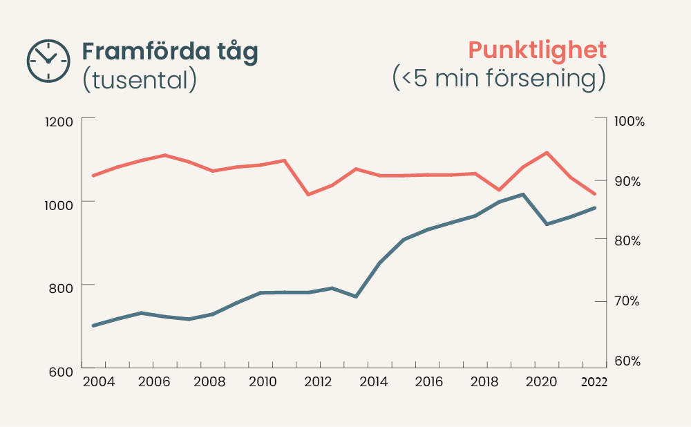 Sedan 1990 har trafiken på den svenska järnvägen ökat med 65 procent. Samtidigt har varken underhållet eller kapaciteten byggts ut i takt med behoven. Spårsystemet är i stort sett detsamma som för hundra år sedan, men används nu av fler tåg än någonsin tidigare. Resultatet är ett hårt belastat järnvägsnät med växande underhållsskuld, begränsad kapacitet och en ökad känslighet för störningar.